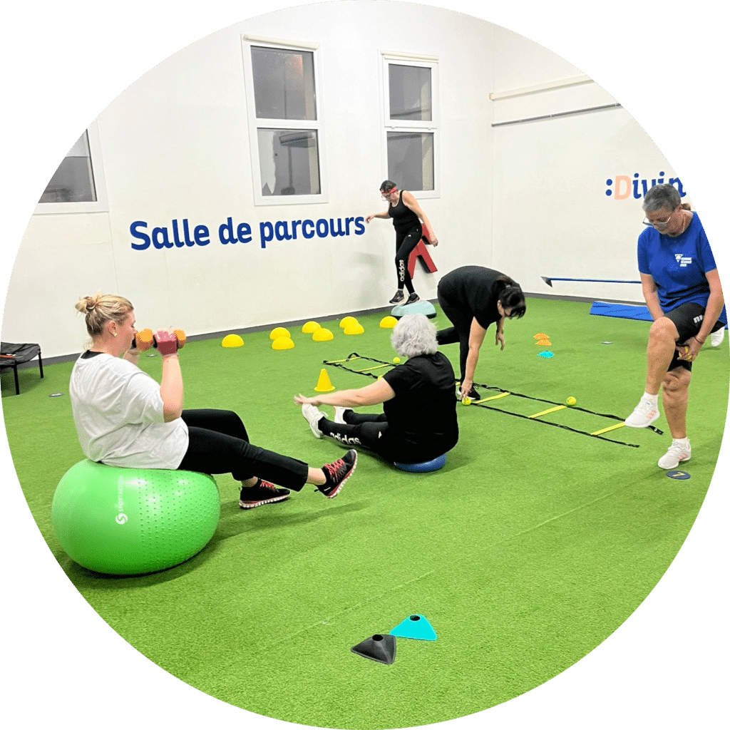La 2ᵉ partie de séance est consacrée au parcours moteur qui change toutes les semaines. Il peut y avoir des parcours d’endurance, abdo, équilibre, un combiné de tout, cela dépend de notre imagination et de l’objectif visé. Tout ce qui est proposé est adapté à vos possibilités / pathologies.
